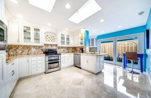KITCHEN- This kitchen includes a granite top mini bar table with stools, a large beautiful dinner table and chairs, all new stainless steel appliances which include the following: Dishwasher, fridge & freezer, microwave, oven, and gas stove top. This kitchen offers all cooking necessities such as silverware, dishes, pots and pans, glass cups, wine glasses & champagne glasses. Also includes a toaster, Keurig coffee maker, tea maker, blender, barbecue utensils, all commonly used condiments, and all cooking basics!