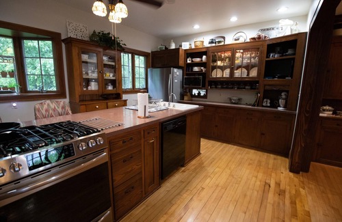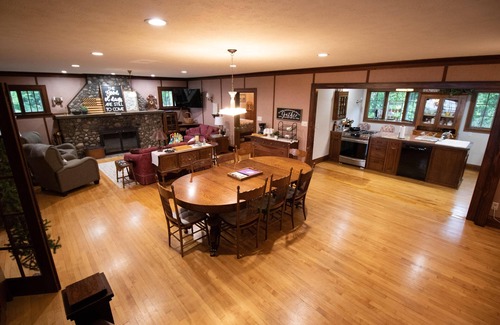 Our generous floor plan provides sleeping for approx 14 guests. It has one full and one half kitchen, two refrigerators, two full bathrooms, and a massive master suite. Attention to fine details has been paid to this home abundantly, from the fine woodwork to the marble floor, not to mention the stone fire place in the great room. Our home also offers 2 separate enclosed sun porches as well as a large outdoor deck area with patio furniture and gas grill. Our focus is to provide you with enough gathering space yet plenty of private space for your large group. We attend to the tiniest details of our home which include quality linens, carefully selected kitchenware, comfy beds, including a toddler bed for the little one, and a unique play space for the kids.