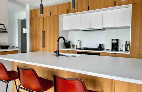 This brand-new, modern smart home has 3 bedrooms, 3.5 bathrooms and can comfortably sleep up to 6. It comes equipped with all of the luxury amenities you could dream of, including a private pool, hot tub, sauna, fire pit, and gym. The home also has ultra-fast wifi (300mbps) and includes 2 state-of-the-art workstations equipped with 38” monitors, cameras, and microphones. Much of the home’s tech can be controlled via our app, from turning on the lights to locking up.