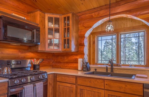 The kitchen is ideal for entertaining with expansive countertops against log walls and a wet island facing the living and dining room. All new appliances and a thoughtful complement of utensils, pots, pans, crock pot, air fryer, etc. are provided. Coffee bar includes a burr grinder, a supply of fresh, organic coffee beans and a drip coffee maker. Bring a few CD's to enjoy cooking to your favorite tunes. Or enjoy the classical music loaded in the CD player tucked under a corner cabinet.