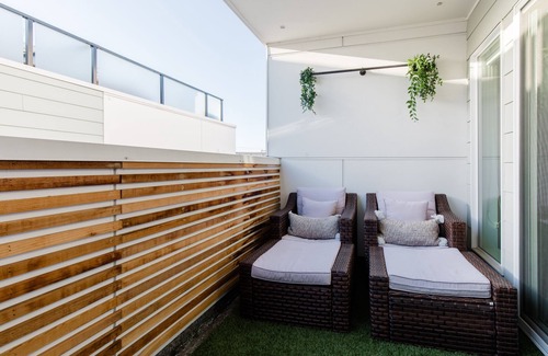 - The primary balcony opens directly from the primary room. The balcony has two large outdoor chairs with ottomans (which can be used for additional seating) and side tables for coffee, wine or a laptop. Although the rooftop is the best place for a view, the private balcony provides guests fresh air and a quiet, secluded space. Enjoy the most sun in the afternoon.