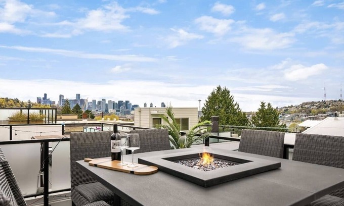 The best part of the house is the view! Whether you want to have a romantic dinner overlooking the city or front row seats to the Fourth of July or NYE's fireworks, the rooftop is not to be missed. We have furnished the rooftop to please all! Watch a game on the outdoor TV or enjoy sitting around the 8 person dining table with built-in fire pit. In the summer months, it is complete with a grill and bar cart. As the weather gets warmer, the rooftop planters will have seasonal herbs to cook with or to garnish your favorite cocktails (no pesticides have been used while maintaining the plants). Rooftop blankets (Nordstrom brand) are provided for the crisp fall nights.
