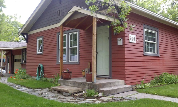 The house measures 1200 square feet, and in addition to that is a large breezeway with a 2-person hot tub and space to park bicycles, and a large, private patio deck area with flowers, raised garden beds, fire pit and gas bbq grill. It has off-street parking under a covered roof in the driveway (just to the left of the photos above), and more parking along the side street. The front yard has huge shade trees in addition to the full size trees along the street. All that shade keeps the house cool in summer along with the help of a window AC unit in the king bedroom and a solar attic fan.
