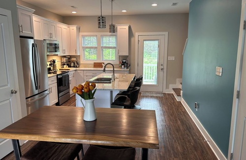 Your stay includes two, spacious master bedrooms with their own master bathroom, a full kitchen set up with access to everything you need to prepare meals, a custom-made dining table that seats 4, a deck with seating to enjoy a wooded view of the sunset as you dine, an electric fireplace, TV access (bring your own streaming passwords), and a half bath on the main level. *Note for allergy purposes--a kitty does reside on this property.