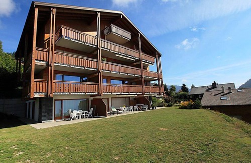 "Fénestral 301", 4-room apartment 100 m2 on 2 levels on 3rd floor, south facing position. Comfortable and beautiful furnishings: living/dining room with panoramic window with open-hearth fireplace, cable TV, flat screen, radio and DVD. Exit to the balcony, south facing position. 1 room with 1 double bed (160 cm, length 200 cm). Exit to the balcony. 1 room with 2 beds (90 cm, length 200 cm). Exit to the balcony. Open kitchen (dishwasher, 4 ceramic glass hob hotplates, electric coffee machine, Capsules for coffee machine (Nespresso) extra, raclette grill, fondue Set (cheese)) with dining nook. Bathroom, sep. WC. Upper floor: 1 room with 2 beds (80 cm, length 200 cm). Shower/WC. Balcony, south facing position. Terrace furniture, deck chairs (4). Very beautiful panoramic view of the mountains and the valley. Facilities: hair dryer. Internet (WiFi, free). Parking, garage space n 301. Please note: non-smokers only.