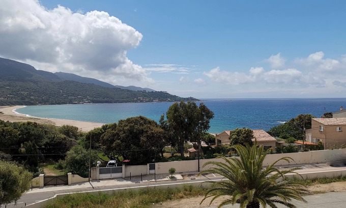 Apartment type F2 air conditioned, comfortable, refurbished in May 2019, breathtaking view of sea and mountains. Beaches at 100m. 1 bedroom with double bed in 140, sofa bed in 120 in the living room for 2 people. Mezzanine with 2 single beds.