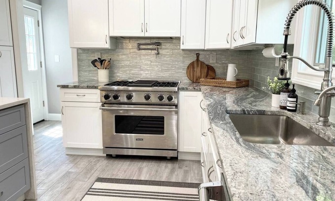 Nestled among the trees in a quiet, residential neighborhood. This spacious 4 bedroom, 2 full bathroom home can accommodate up to 8 people and is perfect for family getaways or tranquil work retreats. The entire house was newly renovated with high end appliances, fixtures, and finishes. This house has beautiful hardwood floors, granite countertops, and gets tons of natural light.