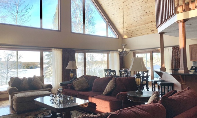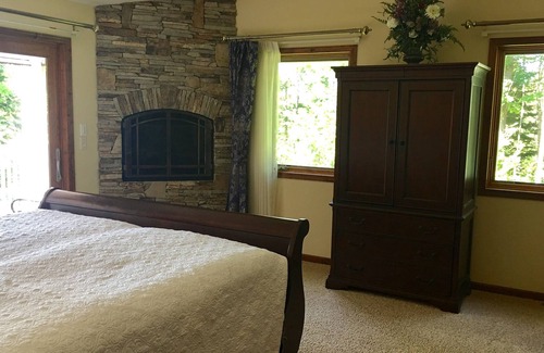 Enjoy spectacular sunsets over the crystal clear waters of the Chippewa National Forest's Lake Wabana nightly from the great room. The fall colors are amazing! The home has a large kitchen with a central island, perfect for entertaining. It also features two fireplaces, two whirlpool baths, wi-fi, two fire pit areas, a washer/dryer, and a deck with a grill. Enjoy a nice dip in the large outdoor hot tub overlooking the lake (see service note). Walk down to the lakefront to enjoy the private 257 feet of sandy lakeshore, a sand beach swimming area perfect for children, a large gathering area, grill, screened-in gazebo, boat dock with a platform area for fishing, and the use of at least one tandem kayak and two paddleboards. Pontoons and motorized fishing boats are easily available for rent just three docks down at Murphy's Landing or from Grand Rapids Marine in Grand Rapids. There are wonderful wooded lakefront locations to pitch a tent for the kids. The first floor and beach access are handicap accessible. There is a convenient lift down to the lake/beach/fire pit area which operates from June to October. The first floor features a full kitchen, 1/2 bath, living room, dining room, laundry, master bedroom, and bathroom. The master bedroom features access to the deck, a fireplace, a king-size adjustable bed, a TV, and a bathroom with a marble-tiled shower and a walk-in tub. The living and dining room features vaulted ceilings, large windows, a large fireplace, access to the deck, and a smartTV for those rainy days.