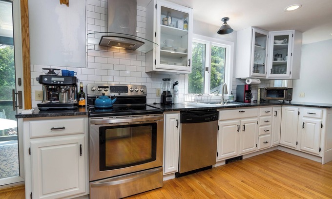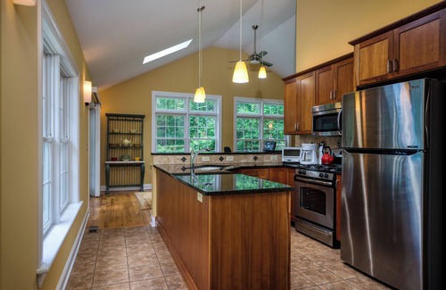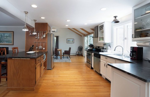Sunny modern home with separate luxury guest house. 3 lovely bedrooms in main house, 2 with en-suite bathrooms, tasteful living room and reading room, along with chef-equipped kitchen. Screen porch and deck overlooking fire pit, large swimming pool and views of October Mountain. Guesthouse has master bedroom on main floor--no stairs to climb -- along with 1 1/2 baths and open-plan living, dining and kitchen with extra high ceilings. Gardens surround the house and pool. Five minute drive to Guido's, 7 minutes to Lenox downtown & Tanglewood. Walk to Meditation Meadow!