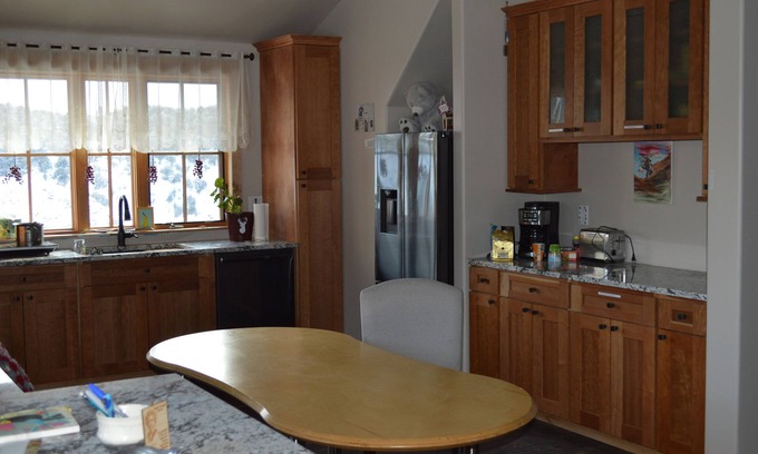 This one bedroom apartment above a garage has fantastic night sky, great views, is close to Eagle (including the bus stop where the free bus can take you to Vail, Beaver Creek) and the various biking and hiking trails. A fun quirky place to stay in the mountains of Colorado within 2 miles of downtown Eagle. Small outdoor patio with furniture to enjoy the views and mountain air. Note - there is one smaller dog on the property that is friendly but may bark at you to say hello but then settles down. Also, the stairs are steep and there is not a full kitchen but instead a kitchenette. There is only one bed (the bunk bed is removed) but the green chair in the bedroom can pull out for a small sleeping space. Plus one complimentary www.innerlightjuice.com per person.