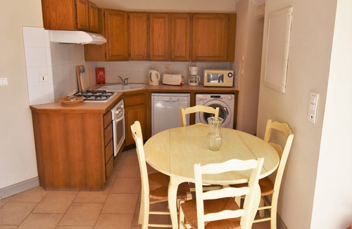 * A compact, but fully equipped kitchen with cooker, fridge freezer, dishwasher, washing machine, microwave, kettle, coffee machine. A dining area with a painted wooden table and four chairs and French doors opening onto the private terrace