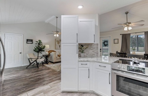 The house features an open-concept living room and kitchen area alongside three bedrooms. The master suite includes a spacious king-size bed, a generous closet, and an ensuite bathroom equipped with double sinks, a sizable shower, and a washer and dryer. The second bedroom also offers a king-size bed and ample closet space. Meanwhile, the third bedroom provides a queen-size bed, a private bathroom, and its own outdoor access.