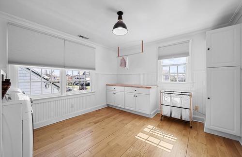 The second floor has a tranquil master suite, with king bed and a spacious en-suite bath and steam shower; an additional queen bedroom that can also be used as an office; another full bath with tub; a third bedroom is set up currently as a nursery with a crib; and a spacious laundry room completes this level.