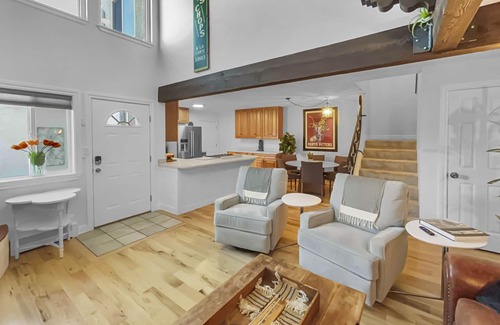 This unique and cozy space is one you'll be telling your friends about. Downstairs you will walk into an open concept living/dining/full kitchen with everything you need during your stay. The home has a heated garage and lots of outdoor space to enjoy your coffee or wine. One bedroom is located on the main level with a king bed. You will also find a full bathroom with a walk-in shower. A full washer and dryer can also be found on the main floor next to the rear exit to the patio. On the second floor, you will find an upstairs balcony overlooking the living area that has whimsical decoration and a nomad working space with highspeed internet. Here on the second level is the primary bedroom with a King bed and private ensuite bathroom with full bath. Also, upstairs is the third bathroom and bedroom with two twin beds, and its own private balcony complete with its amazing moonrises.