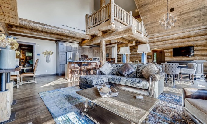 If you’re looking for the true “Colorado mountain lodge” experience for you and your group, you’ve found it! Falcon Mews Lodge has it all: massive log construction, majestic views of the mountains and ski slopes, a great deck with a large hot tub, a gas firepit and outdoor dining table, luxurious finishes throughout the home, and so much more. The only things missing are you and your family and friends!