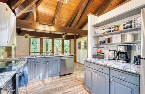 Inside, high ceilings and a modern rustic vibe create a welcoming space. The fully updated kitchen features granite countertops, tile backsplash, and stainless steel appliances. Relax in the spacious living room with a 65" Roku TV, dine at the large table, or sip morning coffee while listening to birdsong.
