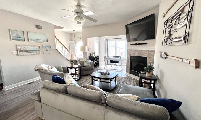 Step into our beautiful beach retreat just a 3 minute walk from the beach! Inside are 3 large bedrooms- each with their own TV and private bathroom attached as well as an additional half-bath on the main level. Play pool or ping pong on our convertible dining room table! The kitchen is fully equipped with all you need including a Kuerig coffee maker and complimentary k- cups. Hang out in the backyard which comes with a charcoal grill, yard games and 3 relaxing sitting areas; perfect for family get-togethers!