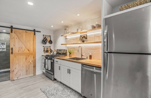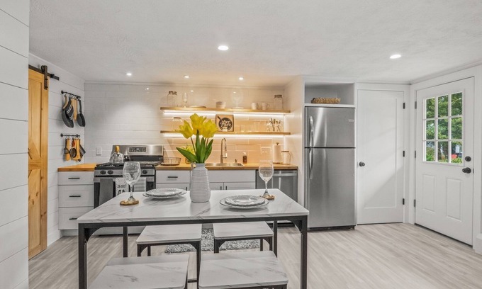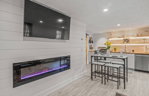 Inside, you’ll find a fully updated kitchen with a brand-new range, dishwasher, refrigerator, Keurig and drip coffee maker, and all the cookware you need to dine in. The sleek, modern bathroom features a walk-in shower and in-unit washer and dryer for your convenience. Enjoy cozy nights by the fireplace, stream your favorite shows with Roku and high-speed internet, and stay comfortable year-round with a smart thermostat and air conditioning in the summer.
