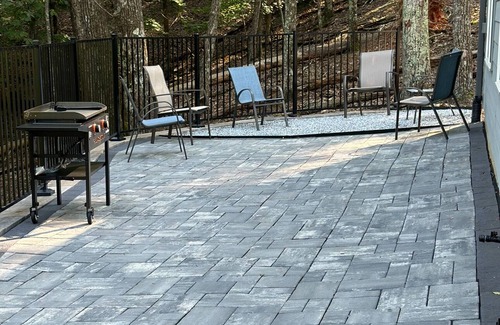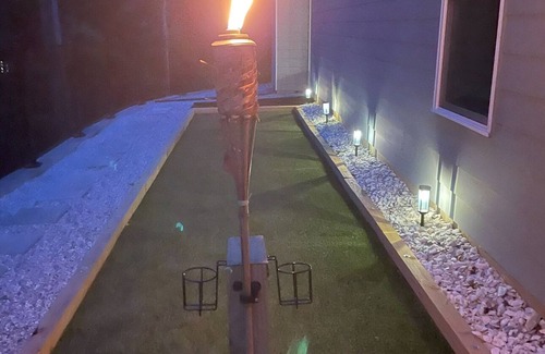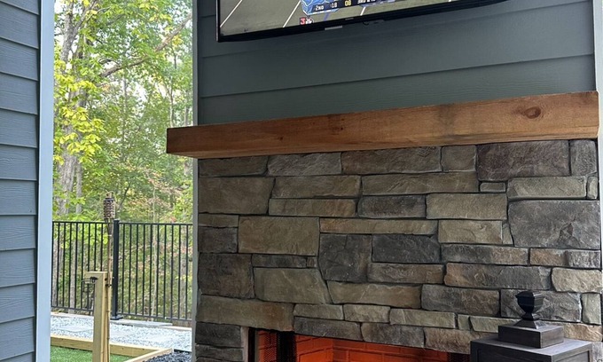 This scenic getaway offers a turf cornhole/bocce course, a gorgeous outdoor fireplace and TV combination, and a fenced in patio to sit and enjoy the sounds of nature.