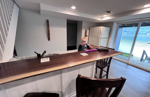 On the road level there is a great room with a modern fully stocked kitchen, dining area overlooking the lake and sitting area by large screen TV.