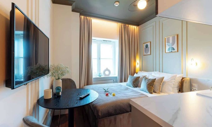 This beautiful, newly renovated and air-conditioned and modern studio apartment is located on the 4th floor of a restored tenement house with an elevator. It is designed for 2 people and consists of a room with a kitchenette and a private bathroom. The kitchen area has all the necessary equipment (including a fridge, coffee machine, kettle and others). In the bathroom, comfort is provided by a shower. The apartment offers access to satellite TV, it also has Smart TV (Netflix) and WIFI wireless internet.