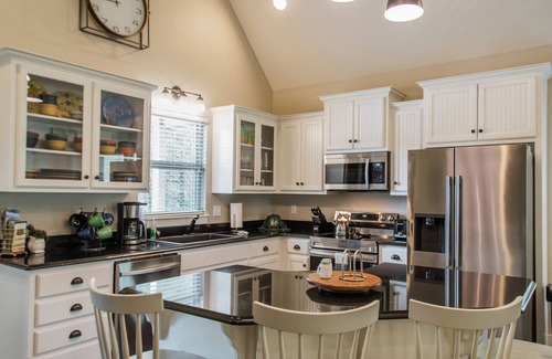 Unwind in the main-level master suite, featuring a luxurious king-size bed, a walk-in shower, and a relaxing jetted tub. The main level also includes a second bedroom with a comfortable queen bed and a full bathroom.