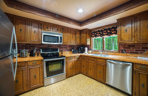 Our lodge has ample living space, a large wrap around deck with a BBQ grill, fire pit, outdoor hammock, 2 fireplaces, dining room, kitchen with breakfast bar, smart TVs, cable service, and Wi-Fi.