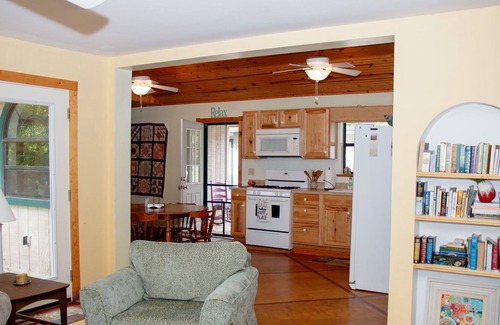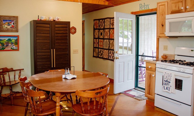 Cute family-friendly cottage 50 ft from the water, with great views from the house. The lake is a hot spot for all kinds of water sports from boating, jet skiing, tubing, fishing, swimming, etc. Boat rental from nearby marinas is available and there is a boat launch just a couple of blocks away. You can tie up your boat at the shore. For your down time, watch movies and enjoy the peaceful scenery. The house is perfect for a long or short stay with all the amenities to make your lake vacation perfect. There are 2 bedrooms, but room for more guests if necessary and the kitchen can handle a small crowd! It has most appliances - coffee maker, toaster, blender, food processor, mixer, crockpot, etc. The kitchen is stocked with basic needs like coffee, tea, spices, condiments, flour, sugar, etc. There is a washer and dryer with laundry detergent supplied as well. The deck is large with plenty of seating and a charcoal grill (charcoal and lighter in the utility room) and gas grill. It is a relaxing setting overlooking the lake. Pets are welcome for a small fee. There is great fishing, boating and golf in the area, and numerous Arkansas attractions nearby including the Buffalo National River and the Ozark Folk Center. Flea markets and antique stores stud Highway 65 both north and south. The owners live next door and are available if you need them.