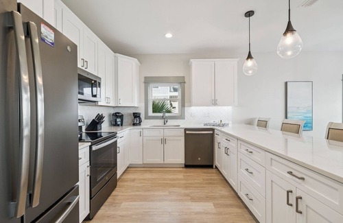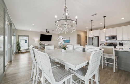 Designed for relaxation and recreation, the ground level of this 3-story home boasts a living space with a couch, loveseat, beverage fridge, arcade game, TV, 3-person table, and sliding glass door to the patio. Indulge in chill afternoons with the group, or make it a kid’s hangout spot. The fun continues outside, where a grill, picnic table, and patio sectional sit in the shade. Venture past the gate to find another picnic table, chaise loungers, and Adirondack chairs surrounding a glistening private pool. At the end of the backyard is a path to the beach for fun along the shore.