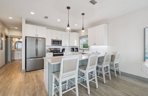 The second-level living, dining, and kitchen spaces are seamlessly connected, offering clear views of the glittering Gulf from every corner of the room. Grab a bowl of buttery popcorn and gather in the living room for a movie night—there’s plenty of seating with a couch, loveseat, and 2 armchairs. Enjoy slow-paced mornings making pancakes in the chef’s kitchen, equipped with high-end appliances and a 4-stool breakfast bar. A table for 8 is by the windows, and out on the shady balcony is an arrangement of patio furniture plus a 4-person table. When evening falls, guests can choose between retiring to the guest bedroom with a queen bed and private bathroom or the bunk room with a full-over-full bed.