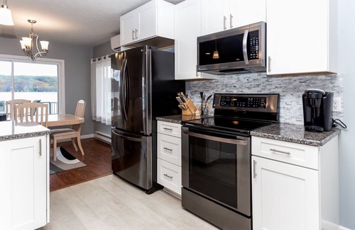 The main floor features an open concept living arrangement for easy entertaining and expansive lake views. A gas fireplace was recently installed to keep you warm during the cooler weather. The kitchen is brand new with granite counter tops, stainless steel appliances, dishwasher, microwave, electric stove. The dining room table seats 8 people and 4 additional people at the breakfast bar located at the island.