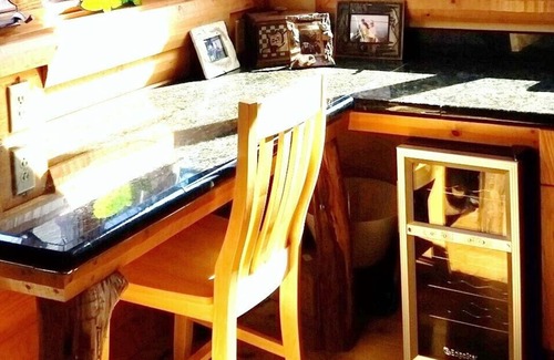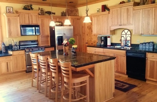 Now let’s take you inside our home….3,000 square feet of living space welcomes your family, friends and guests. Step into the expansive Kitchen, Dining, and eat-at island perfect for preparing that early morning breakfast or barbeque dinner. New stainless steel appliances add an upscale ambiance to this gourmet kitchen, while the knotty pine cabinet’s and granite island and a touch of warmth. Custom knotty pine cabinetry, granite counter tops give this country kitchen character and charm. Service for 17 includes ceramic dishes, small appliances (coffee pot, blender, crock pot, mixer and toaster), cutlery, stainless steel utensils, pots and pans, and many kitchen ‘extras’ are stocked for ease-free entertaining. Dine at our expansive butcher block table, seating for eight (extra bench seating available) under the glowing ambiance of a rustic, reproduction antler chandelier hanging from the knotty pine ceiling.