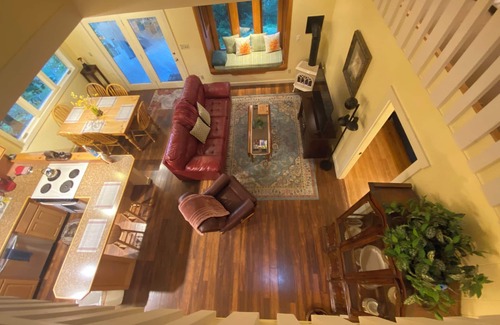 On the main level, the great room is a wonderful gathering space, from the rustic wood floors to the towering cathedral ceiling, complete with skylight and a spacious, secure loft that is a favorite spot for our kids.