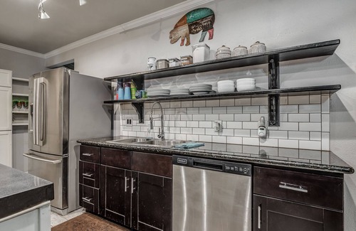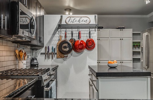 We have a fully furnished 4 bedroom with 2 full bath property. The house is very open and wonderful for entertaining. The kitchen and coffee bar is fully stocked with the essentials. Kitchen has a gas range as well as a very stocked spice cabinet and all the cooking basics you could need (sugar, flour, oils, etc.)