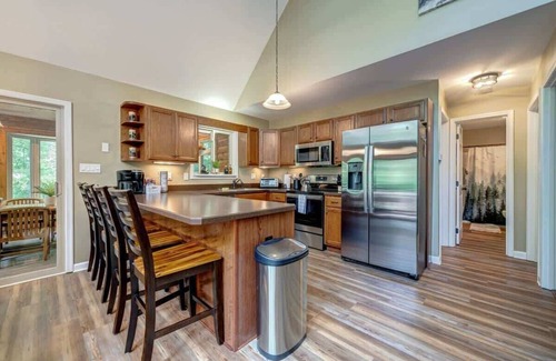 Upon arrival at Toboggan Hill Hideaway, you'll find a gorgeous cabin aesthetic and spacious rooms that make this home comfortable for a group of 10 people. A well stocked kitchen and thoughtful touches make this cabin a perfect getaway for everyone. In the main level, there is an open concept space with large windows, tons of sunlight and great views of nature. A large couch, and dining table are all open to the kitchen, making dinner prep a family affair! Off the main level, there is an expansive deck with plenty of seating to enjoy some time outside without leaving the house. In the lower level you will find board games, an air hockey table and access to the private hot tub and fire pit area. You will also find access to kayaks that can be taken to public river access areas locally.
