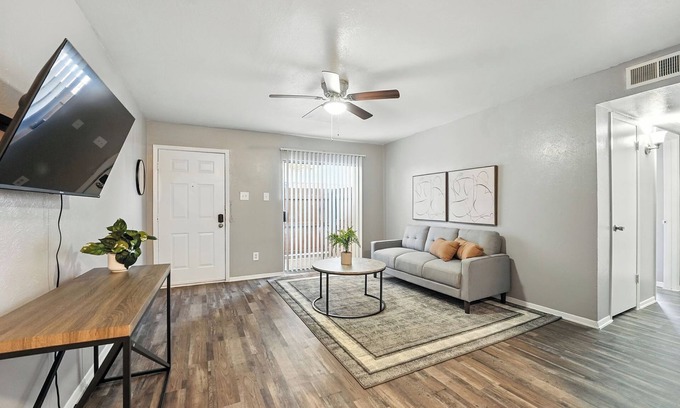Our furnished 2-bedroom, 1-bath apartment is perfect for families, professionals, or roommates seeking a functional midterm rental. Each bedroom includes a queen bed and ample storage space, while the bathroom is conveniently located for easy access. The open living and dining area comes fully furnished for relaxation and everyday living. A practical all-electric kitchen includes all major appliances, and the unit features central air, WiFi, cable, and a private balcony or patio to unwind.