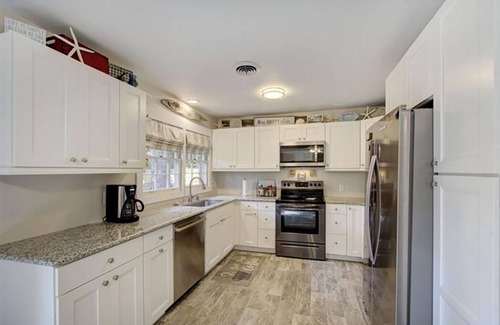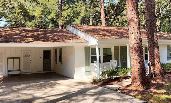 Kellys On The Coast is in a great location! Enjoy waking up peacefully, to watch the sunrise as you enjoy your morning coffee from the front porch rocking chairs. You may hear the ocean while enjoying the views of huge live oaks and pines in the front yard. Stroll across the street through the park or walk the quiet block to beautiful Ocean Beach. You are welcome to use our beach chairs, and wakeboards, there are fun beach toys available for the kids as well. When you return home to unwind you will love how the fully equipped kitchen flows nicely into the living room with cozy furnishings. All three bedrooms have a smart TV. The master bedroom has a King bed, and the 2nd Bedroom has a Queen bed, the 3rd bedroom has 2 Full beds and 2 Twin beds. After dinner, you may want to enjoy the large backyard with a privacy fence. Relax reading your favorite book while lying on one of the two hammocks. If you're looking for one more adventure before the end of the day, perhaps bike to Horton Pond to see alligators and turtles, Driftwood Beach for epic views, and end your day at Clam Creek Pier to catch a stunning sunset. There's always tomorrow for more biking, golf, tennis, kayaking, boat tours, trolly rides, mini golf, beach combing, horseback riding, summer waves, the Historic District, shopping, and experiencing awesome cuisine at the many Island restaurants along with much, much more.