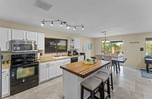The home sleeps 9 people in beds and one more if choosing the couch. There is also a pack 'n' play for the little one. If you are using this as a work and play space the desk is located in the family room so you aren't missing out on all the fun. Just above the desk is the tablet that controls the heated pool and spa for your stay. There is a water gallon system located in the kitchen. You can choose to pick up the jugs of water if you would like to use it. Water is also located in the refrigerator. The fire-pit in the backyard requires propane. Please note: When propane tank is provided guests are required to fill during their stay for use. If you choose to use it you can bring the tank to the local Ace Hardware about 5 minutes away and they can swap it out or fill it for you.