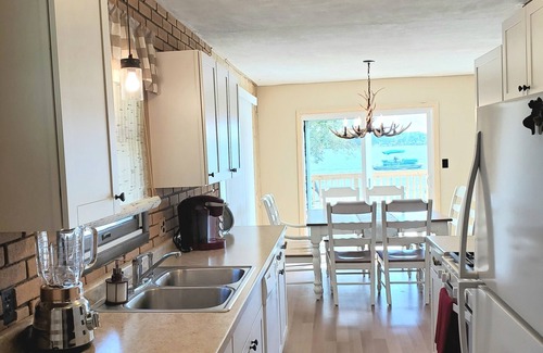 The main floor is open concept with all appliances, a fully stocked kitchen, Keurig Coffee Bar and Mr. Coffee. Double dining/game tables seat 12. Rainy day board games are in the pine bench. The living room has a 55" smart tv and opens to the 12" x 25' deck with dining set and rocking chairs that boasts beautiful sunrise Round Lake views.