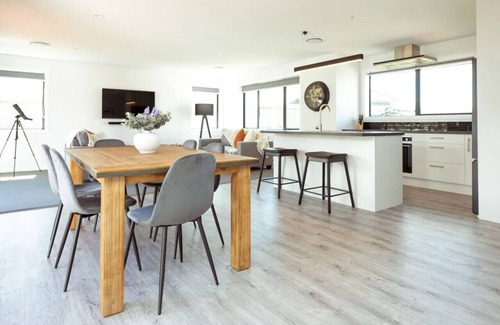 The modern kitchen and dining area are fully equipped for holiday meals, with seating for six at the dining table. Enjoy the latest entertainment with Fibre Wifi, Freeview TV, streaming channels, and Chromecast, all enhanced by a soundbar for movie nights in. Plus, the ducted heat pump ensures year-round comfort, whether you're visiting during snowy winters or warm summers.