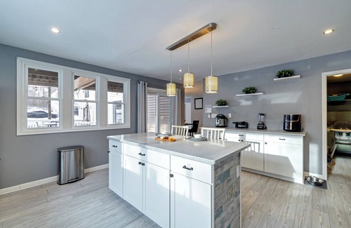 ☀ Modern Kitchen: Fully stocked with all the essentials—appliances, utensils, and cookware. The kitchen features two dining tables and a breakfast island, perfect for hosting group meals.