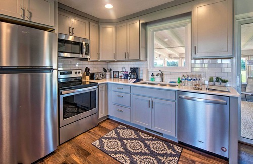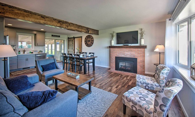 During your vacation's leisure hours, share quality time in the open-concept living space, where an exposed wood beam and a brick fireplace set a calming environment. Watch family favorites on the flat-screen TV while the group's designated chef utilizes stainless steel appliances to prep gourmet feasts in the kitchen.
