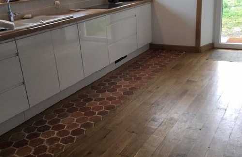 - kitchen with oak parquet flooring with a beautiful wooden table/bar,