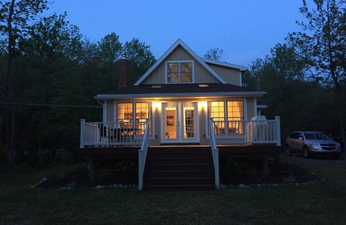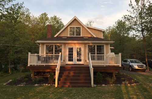 A few years ago, this house has been completely gutted, expanded and updated from its original A-frame and is currently 1,800 square feet. You will find in the small entryway a shoe box and coat closet (which includes ponchos and umbrellas, badminton set including net, and rackets, tennis rackets and balls), next you will enter the modern kitchen with white cabinets, stainless steel appliances and granite countertops, and an island which accommodates up to 3 seats. The kitchen also includes a pantry, which will be available for your use. The living room includes 2 couches and a TV (with access to both Amazon and Netflix) a DVD / Blu Ray player, as well as several kids and adult DVDs. On the ground floor, is a large bathroom with double vanity sink, and full tub with shower. The house may accommodate only up to 10 persons: 6 adults and 4 children. There are also 2 bedrooms located on this floor: one with a queen bed as well as a child's crib, and another with a full size bed. One of the most amazing features of this house is the beautiful sunroom, as it has large panoramic windows from 3 sides. This is where you will find the dining table, with a brand new larger dining table and chairs allowing seating up to 10 persons. And on the other side of the room, you will find a couch and bookshelf, with too many board games and toys and books to list here!