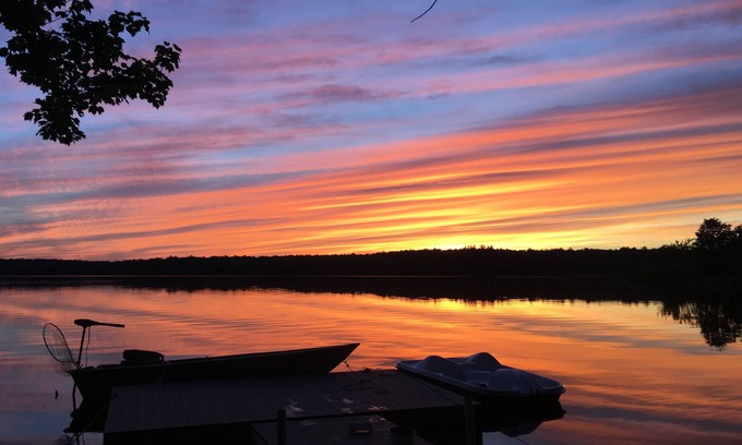 Our property is on ½ of an acre and includes the following beautifully segregated outdoor areas: sitting area of 2 benches and a table located by the brand-new dock, which is perfect for watching sunsets, as they occur in summer months directly across the lake. Next to this area is the walk-in beach, which is updated with new sand every 2 years (this is because the winter storms erode the sand and it needs to be replenished on the dirt and roots - this means that wading into the water is perfect for little feet, and big feet too, of course!). Behind the beach, we have a double swing set, tree house, slide and geometric dome. Perfect for when little kids need to get some energy out! There is also a designated hammock area, with 2 hammocks, each can accommodate up to 400 pounds: for taking family naps after a long day of playing in the water. There is also a patio and fire pit: for making s'mores and relaxing. Please note that this property has vegetation and trees scattered all around, so there are always both sunny spots and as well as shady spots, for those days when it's too hot to be in the sun. And lastly, there is also a shed next to the beach, which includes water toys (buckets, shovels, water noodles and water squirters) as well as life jackets of all sizes, fishing rods, beach lounging chairs, and kids’ chairs. Next to this storage box, you will find the following equipment for water sports: 2 kids’ kayaks, 5 stand-up paddle board (2 are pretty new), and 1 adult kayak. We also have a paddle boat for your use, as well as a dinghy boat (which fits up to 3 adults).