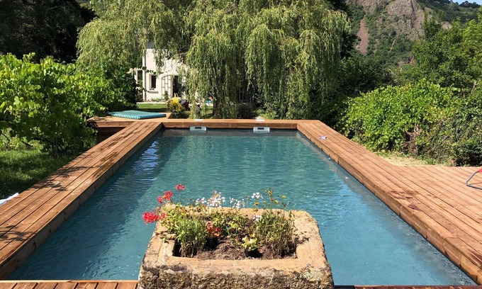 Outside side: The "high" part of the land is completely fenced and planted with trees, several rest areas are arranged in the shade of the many trees. You will find different trees and vines in the grounds. Finally at the bottom of the land, you will enjoy an 11 meter long swimming pool, secured by an alarm system (Please note, the management of the alarm is the responsibility of the occupants of the gîte).