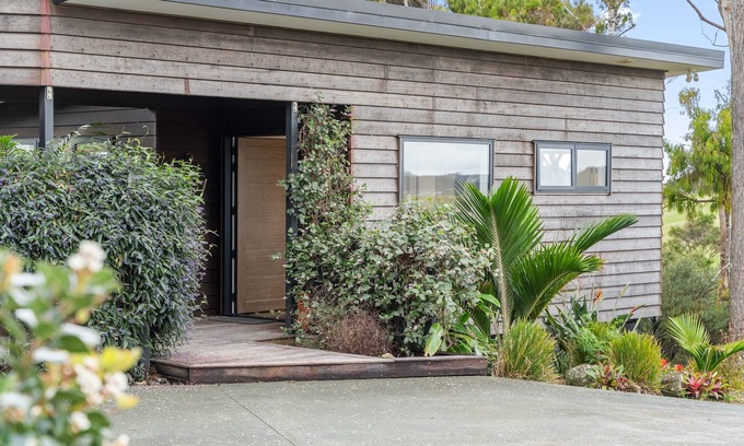 This modern accommodation between Langs Beach and Waipu Cove enjoys an elevated position that offers homely comforts and convenience with sea, countryside, and bush views. The large deck, well positioned outside the two double bedrooms provides the ultimate outdoor living amidst your own private tropical gardens.