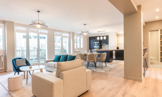 A large living room with sofa bed and TV, a dining area, 3 double bedrooms with 5-star beds, 2 bathrooms with WC (1 with bath) and a fully-equipped kitchen (induction hob, oven, microwave, fridge, freezer, Nespresso coffee maker, kettle, toaster, dishwasher).