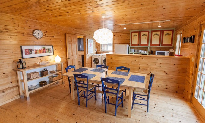 We provide Wifi, and Hulu television. There is also a ping pong table in the lower room, which is 4 steps down from the main level. The lower room also has a couch with pull out bed, as well as a bathroom and reading nook. Enjoy a book from our library in our handcrafted twig chairs!