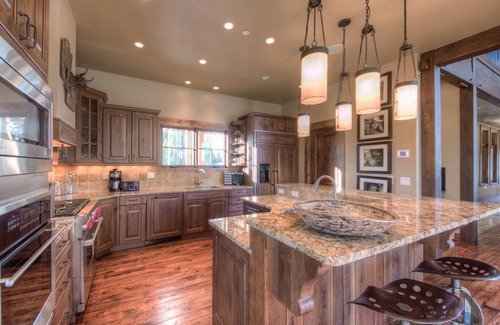 Trails End Lodge is a custom-built and decorated, 5,200 square foot home with 5 bedrooms and 5 1/2 baths. It will easily accommodate 16 guests with ample opportunity for socializing as well as private moments. It is a perfect setup for up to 3 families, 4-5 couples, or for an annual group ski trip. In the spacious living room, you will find comfortable seating in a warm western atmosphere surrounded by a floor-to-ceiling wood-burning stone fireplace. The custom-designed kitchen is fully equipped with granite countertops, two dishwashers, Wolf stove, high-end GE Monogram appliances, and all the accessories to accommodate your group. Two of the three master bedrooms have gas fireplaces creating a very warm and intimate setting. Rooms are tastefully decorated and equipped with flat-screen TVs (5) with satellite programming.